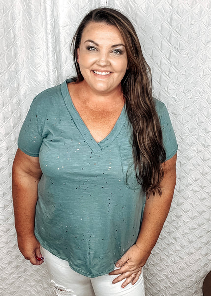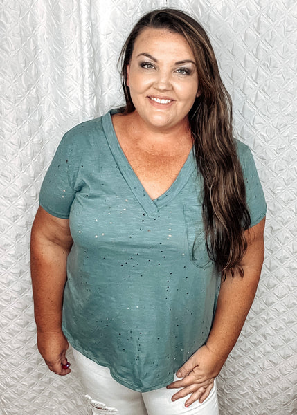 needing some edge?! This cute little knit top has it! Vneck with pocket and tons of cute distressing. Fits true to size. I’m wearing my normal tshirt size.