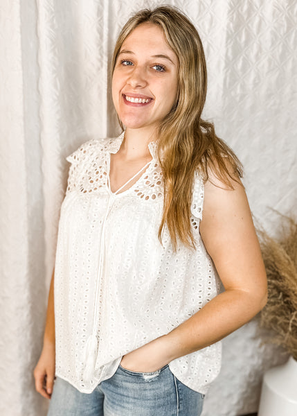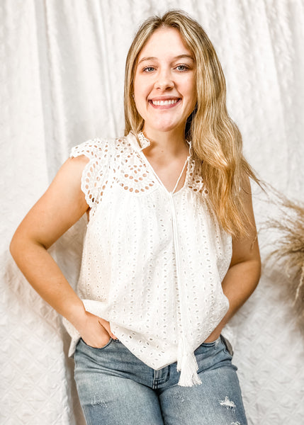 This dainty little top is a must for spring and summer! It is a woven fabric with no stretch but it does have a flowy fit. There is a soft lining underneath so no tank top is needed.
