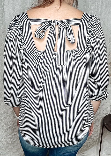 Cute navy and white stripe top with an adorable tie and cutout on the back. Fits true to size. Has no stretch. Relaxed flowy fit.