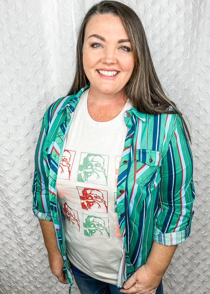 This colorful striped button up pairs perfectly with all those Christmas tees. Soft stretchy material. I recommend your normal tshirt size. If between sizes, I would go up